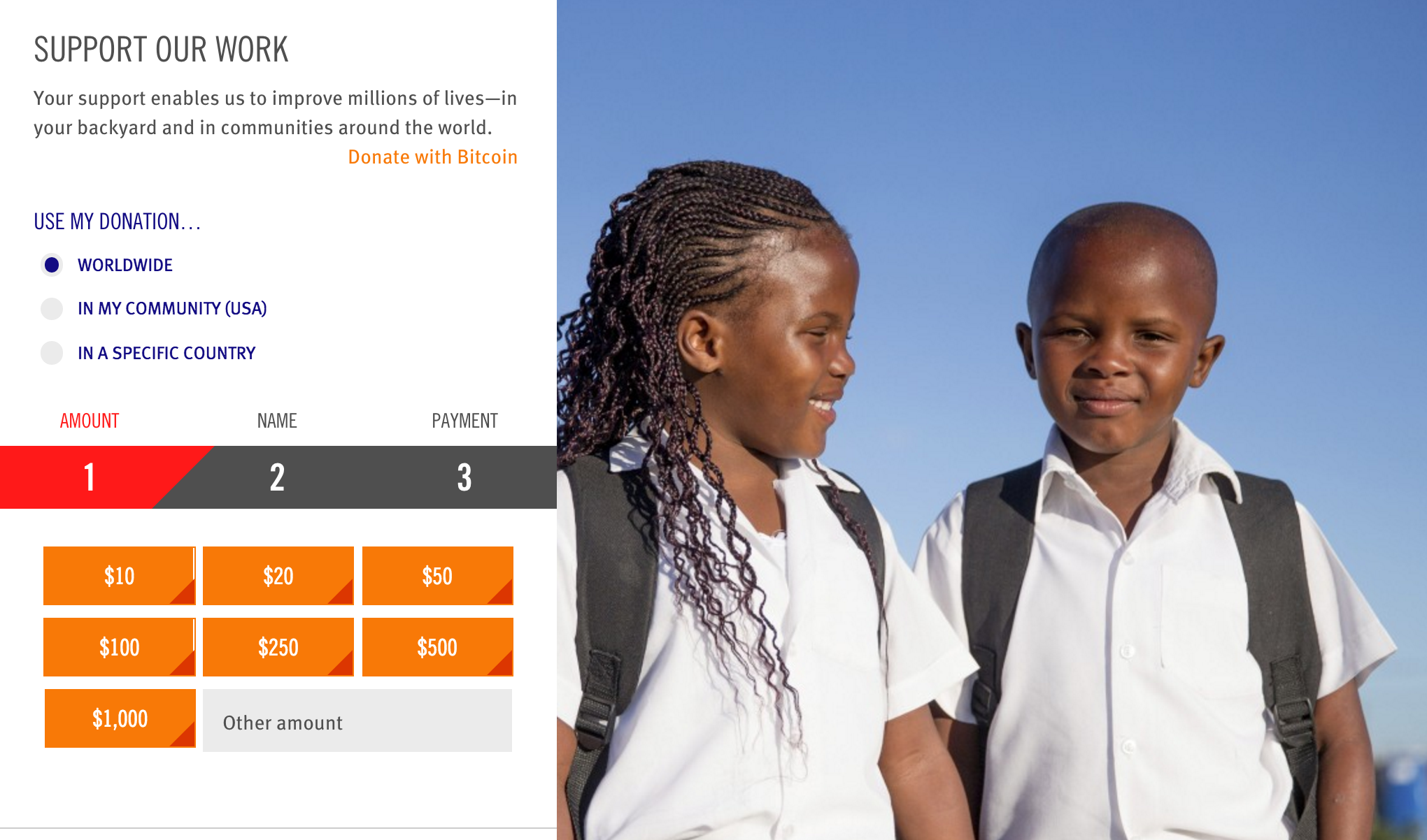 United Way uses photos of people impacted by people’s donations. The organization also gives supporters multiple contribution amounts to choose from.