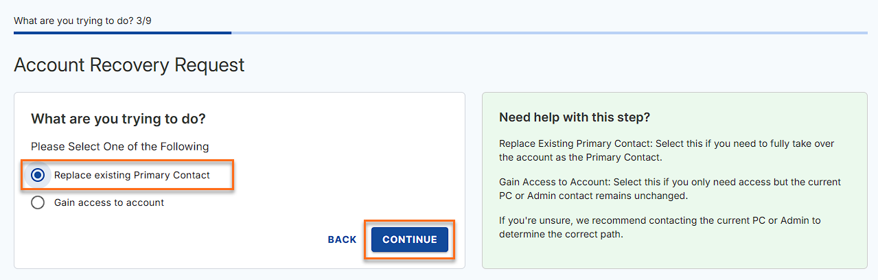 If you select the Admin/Tech role, you see the following options: select Replace existing Primary Contact and click CONTINUE.