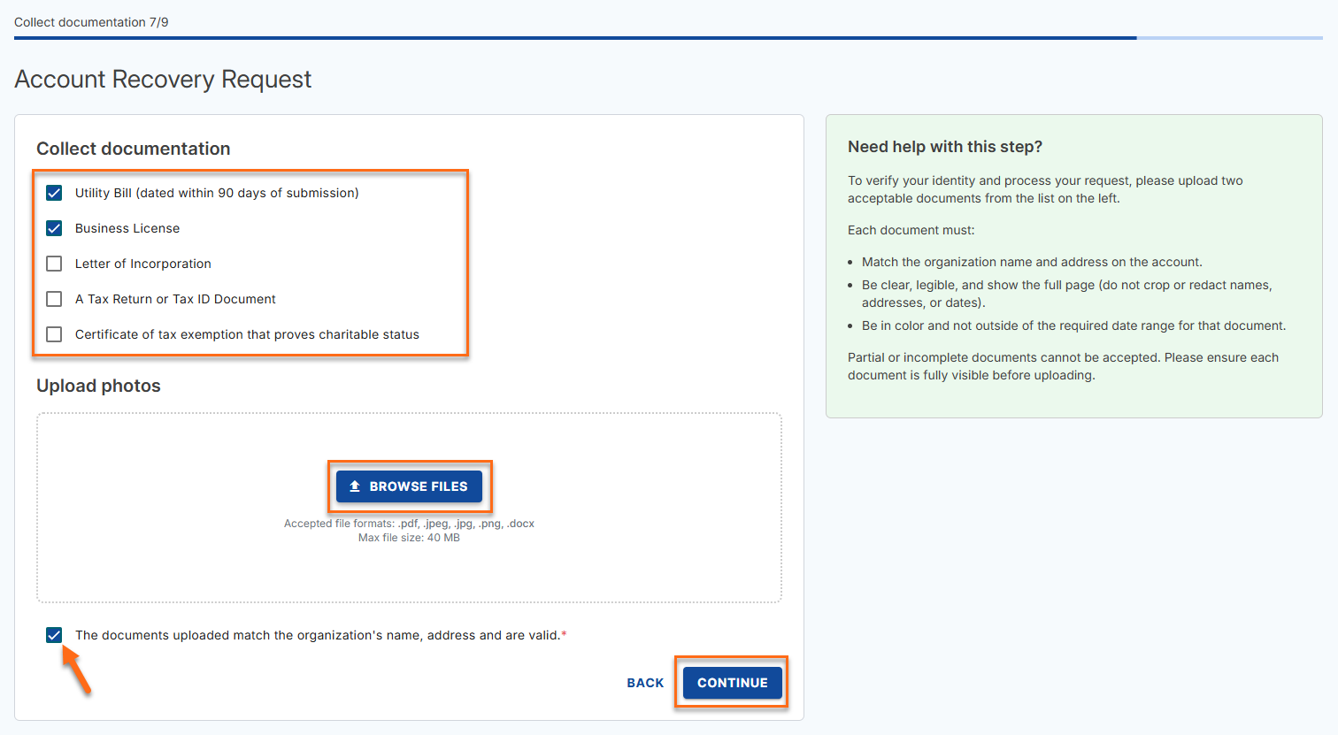 - Select the additional documents you will upload and click BROWSE FILES to upload your documents. Check the box that says The document(s) uploaded match the organization’s name, address, and are valid, then click CONTINUE.
